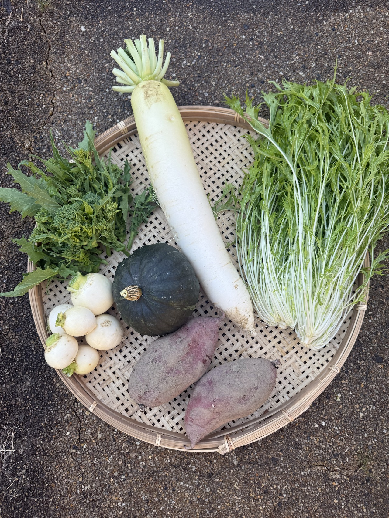 リーフレタス・西洋菜花・水菜・わさび菜・レッドマスタード・白菜・ほうれん草・かぶ・大根・人参・かぼちゃ・さつまいも